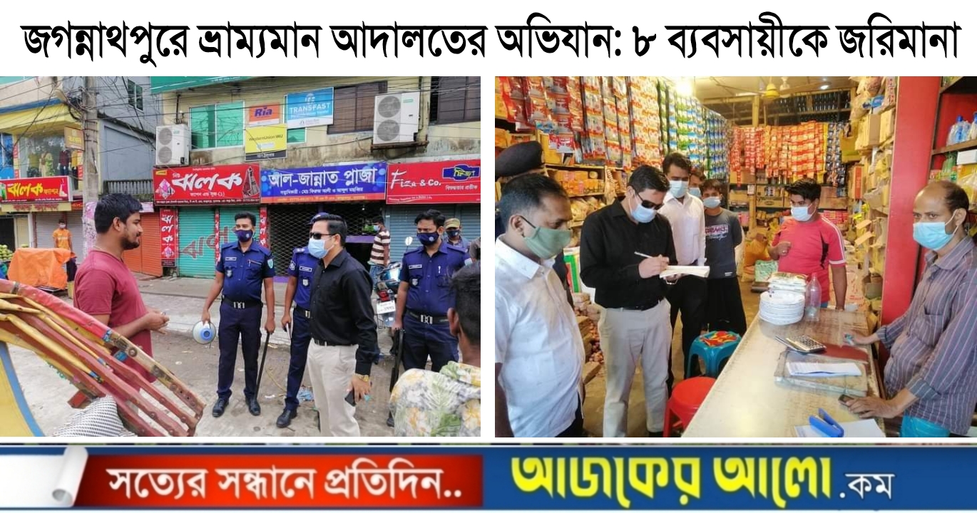 করোনাভাইরাসের সংক্রমণ ঠেকাতে সরকার কর্তৃক ঘোষিত সাতদিনের কঠোর লকডাউনের আজ প্রথম দিনের মাঠে নেমেছে স্থানীয় প্রশাসন। দুপুরে উপজেলা নির্বাহী কর্মকর্তা (ইউএনও) পদ্মাসন সিংহ এর নেতৃত্বে পৌরশহরের জগন্নাথপুর বাজার এলাকায় ভ্রাম্যমান আদালত পরিচালিত হয়। এসময় সরকারি নির্দেশনা অমান্য করে ব্যবসা প্রতিষ্ঠান খোলা রাখায় ৮ ব্যবসায়ীকে ১৪শ’ টাকা জরিমানা করা হয়।